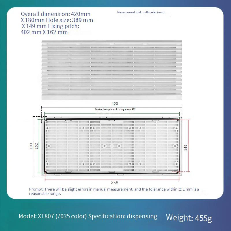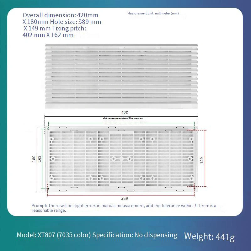 Verfügt über ein austauschbares Filternetzdesign für einfache tägliche Wartung und Austausch, wodurch die langfristigen Betriebskosten erheblich gesenkt werden. Die Rahmenstruktur ist in der Standardfarbe Weißgrau 7035 erhältlich. Es besteht aus einem ABS-Material, das eine hervorragende Verformungsbeständigkeit bietet und eine langfristige Stabilität gewährleistet.